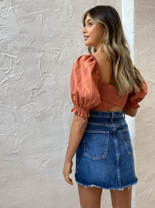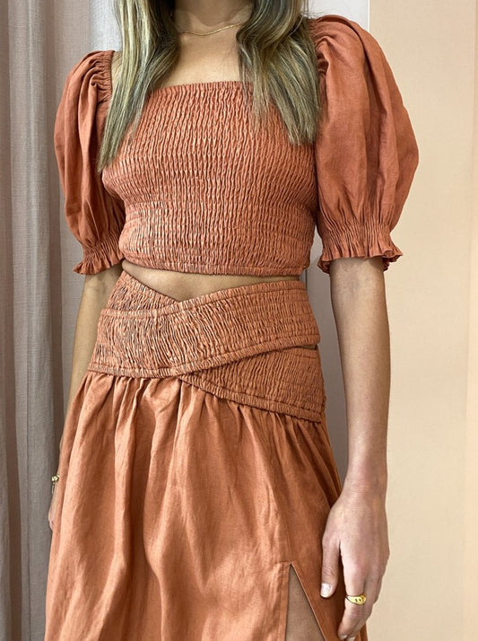 Crafted from a Flax Linen fabrication in a rich Espresso hue, this reversible crop features a straight neckline, short puff sleeves and a shirred bodice to form and accentuate.