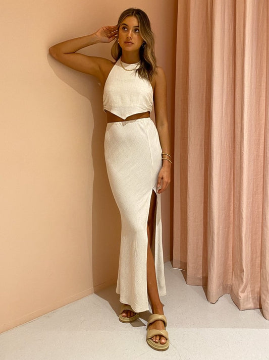 Front panelling and a featured side split highlight the beautiful silhouette, making it the perfect option for long lunches, sunset cocktails or romantic dinners.