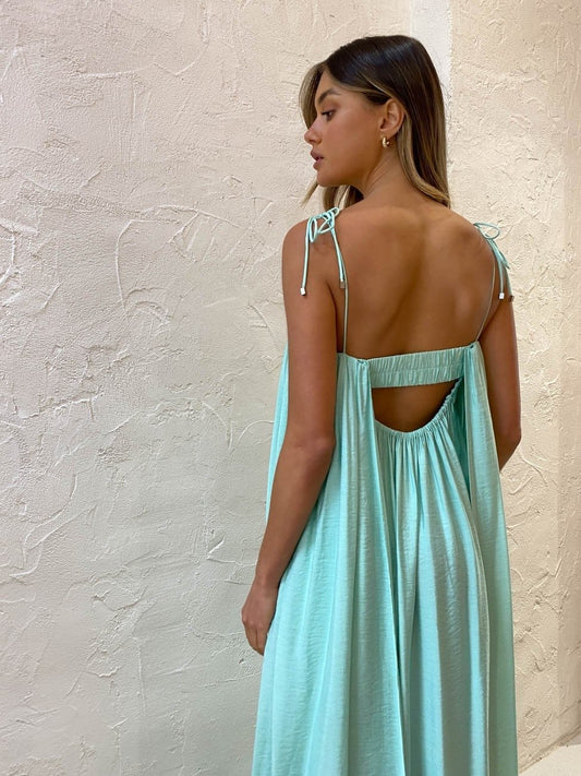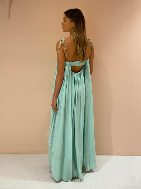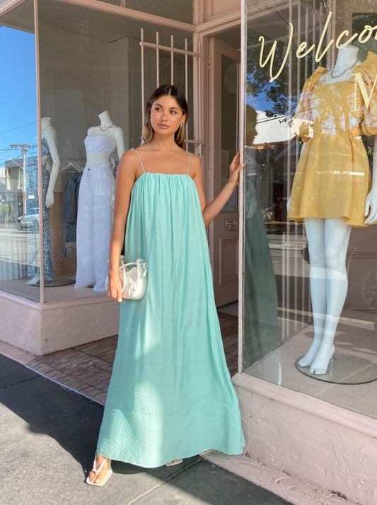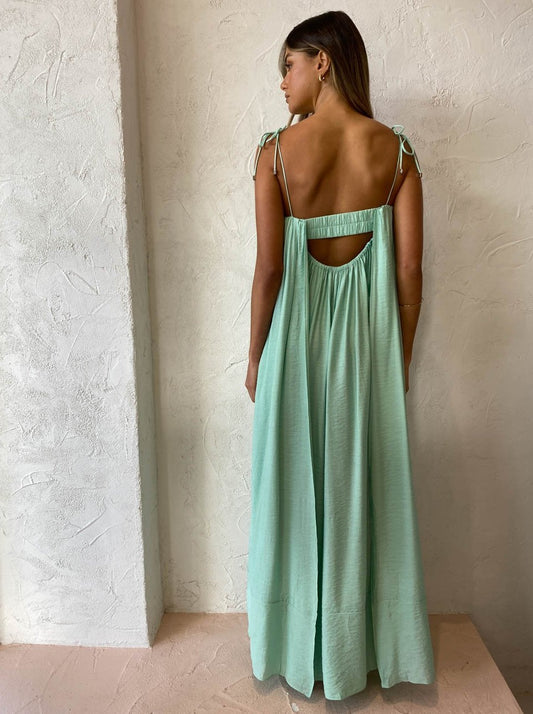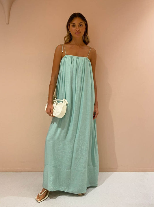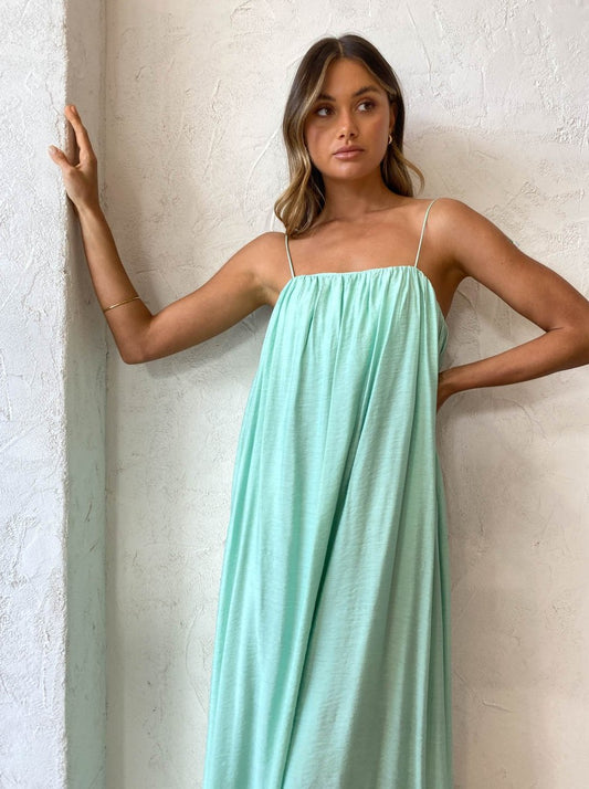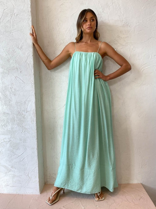 Effortless and romantic, this relaxed silhouette is fully lined and crafted from a Rayon blend in a Seafoam green shade. Detailed with an internal bodice and delicate rouleau shoulder ties, it features gentle gathers across the square neckline that create soft draping in the relaxed maxi length dress.