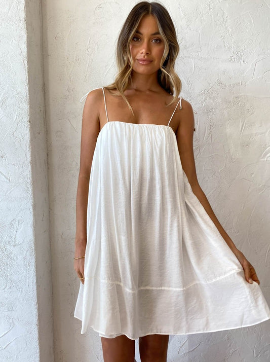 Lightweight and breathable, this delicate mini length swing dress is fully lined, crafted from a Rayon blend in a White hue reflecting a slight sheen. Sitting relaxed on the body, it's cut with a flattering square neckline that highlights the femme décolletage and an internal bodice.