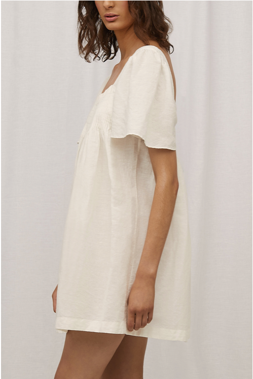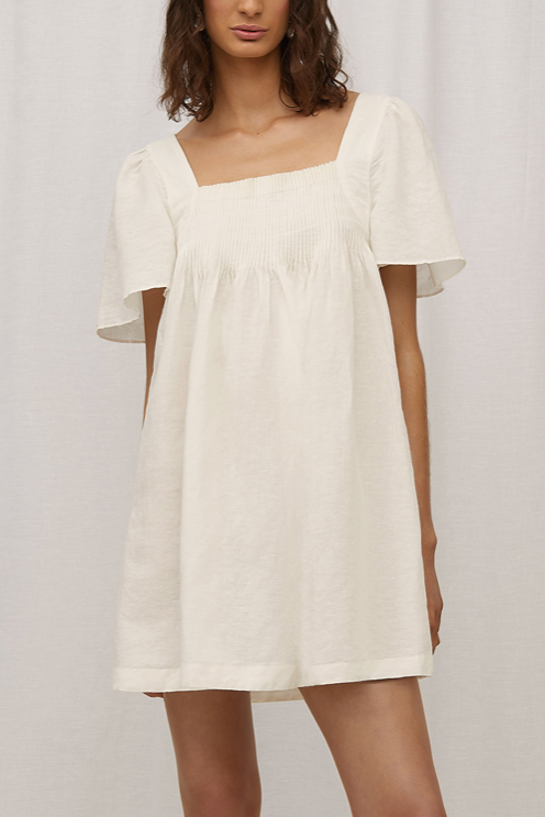 Crafted from a linen cotton blend, this easy to wear mini dress features fine pleat detail at bust with fine pleat detailing and cap sleeves.