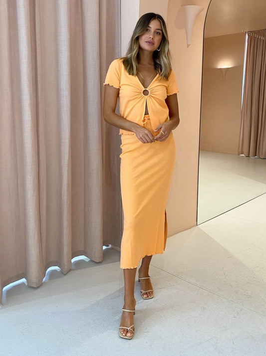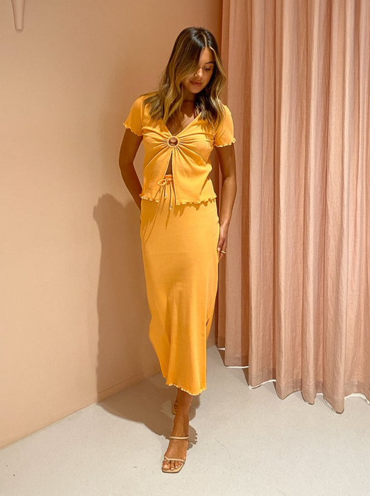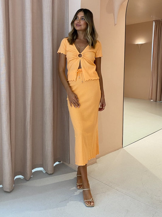 The Steele Dione Skirt in Tangerine is our colour crush of the Summer and the staple that you will be wearing on rotation.