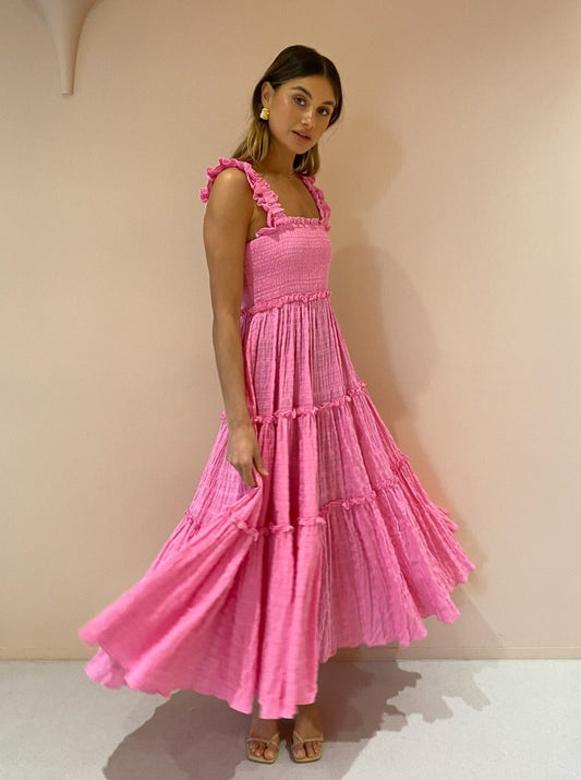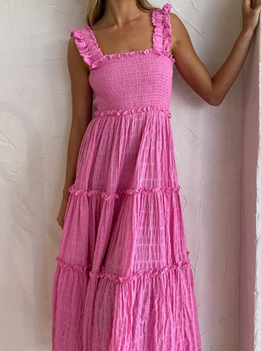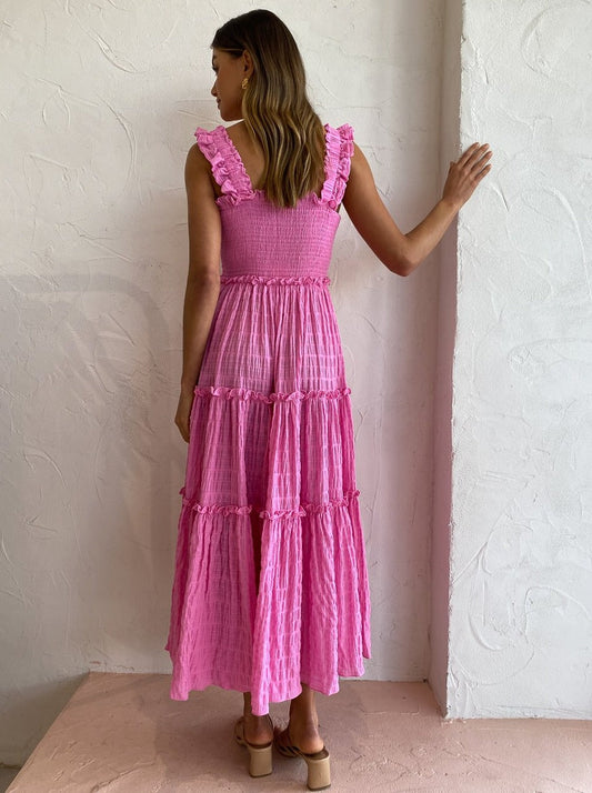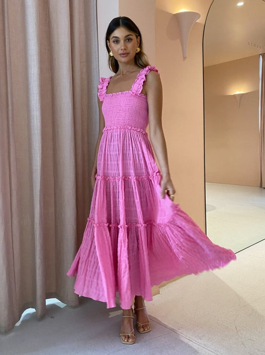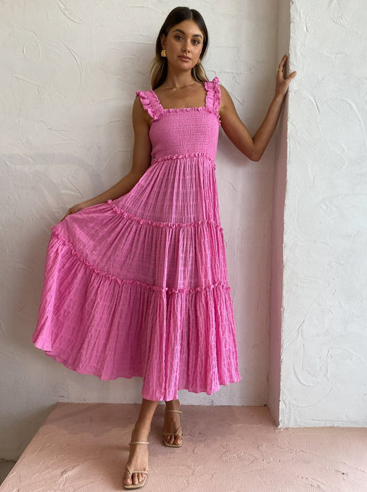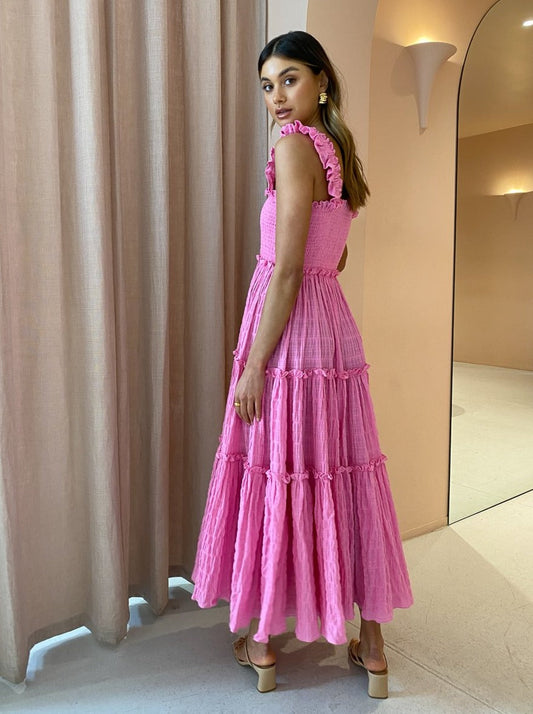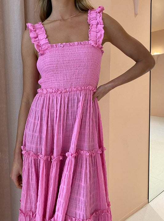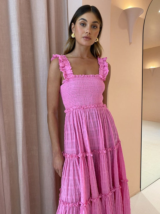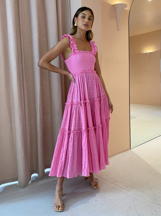 Crafted from a cotton blend fabrication, this midi smock silhouette features chunky frilled straps and a square neckline which gracefully falls into a free flowing tiered midi skirt.