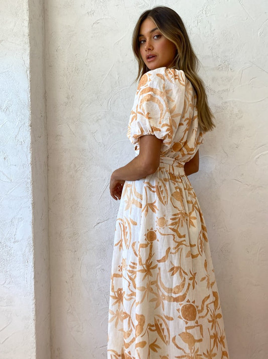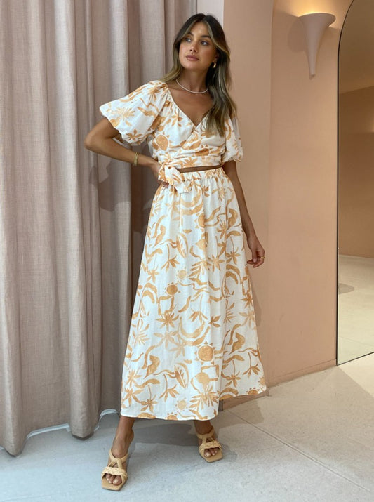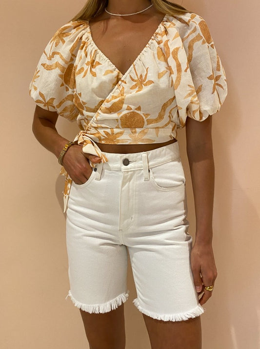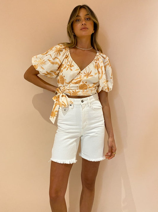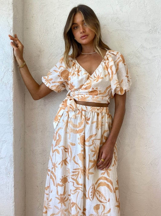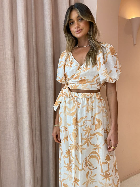 Finishing just above the mid waist, the Murphy Crop can be paired with the matching Jules Skirt in Sand Palmette for Golden Coco moments or paired back with some denim for sunshine weekend wanderings.