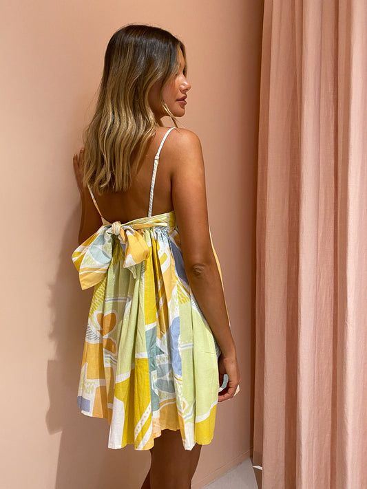 Cut from a breezy cotton and linen blend, this trapeze silhouette features a large bow at the back with pin thin adjustable straps.