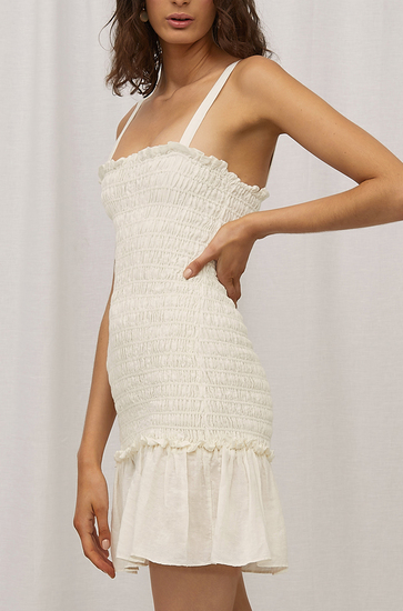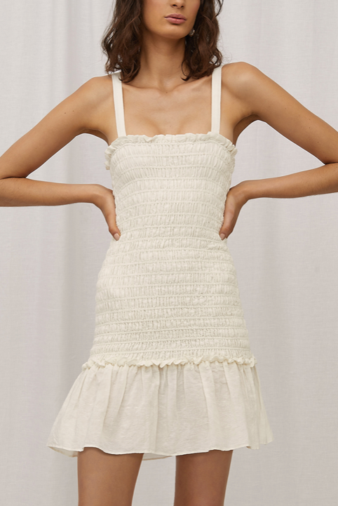 The Steele Samba dress in Blanc is a feminine mini dress with flound skirt. What we love most about this day dress is the firm shirred bodice the extends to the hips for a flattering fit.