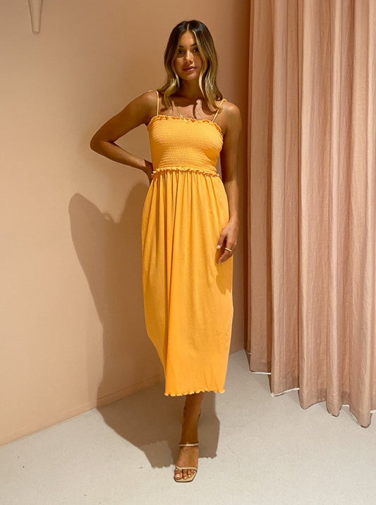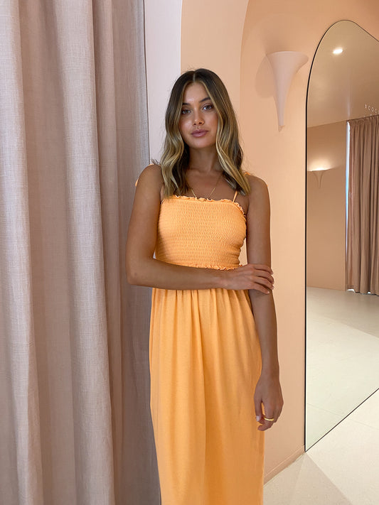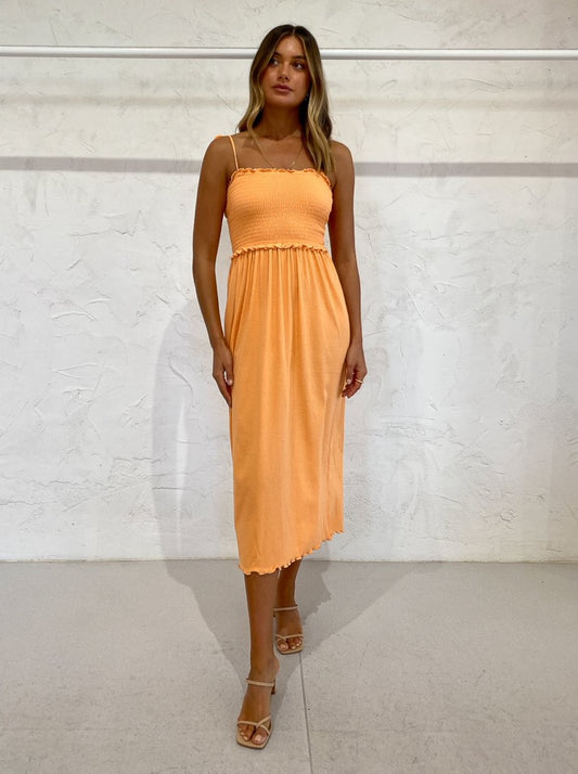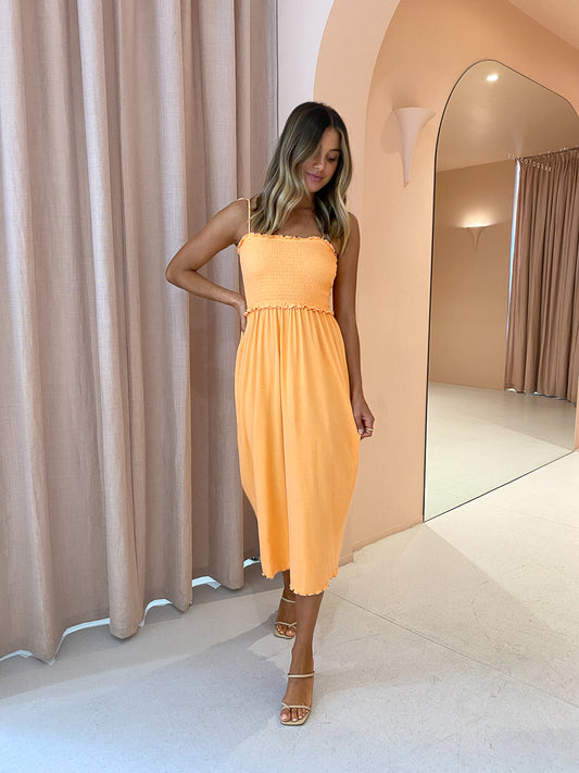 The Steele Zuma Dress in Tangerine is our colour crush for the Summer and your new rotational midi.