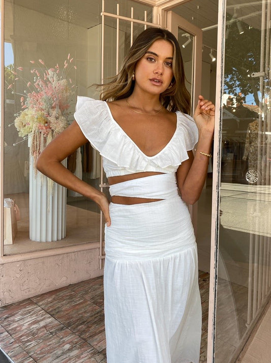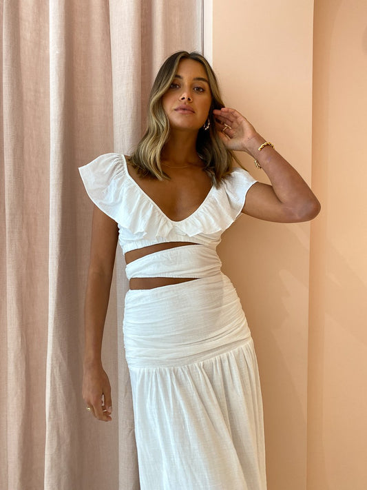 The SUBOO Alva Rouched Cut Out Maxi Dress in Ivory is the elegant piece for all your Summer Soirées.
