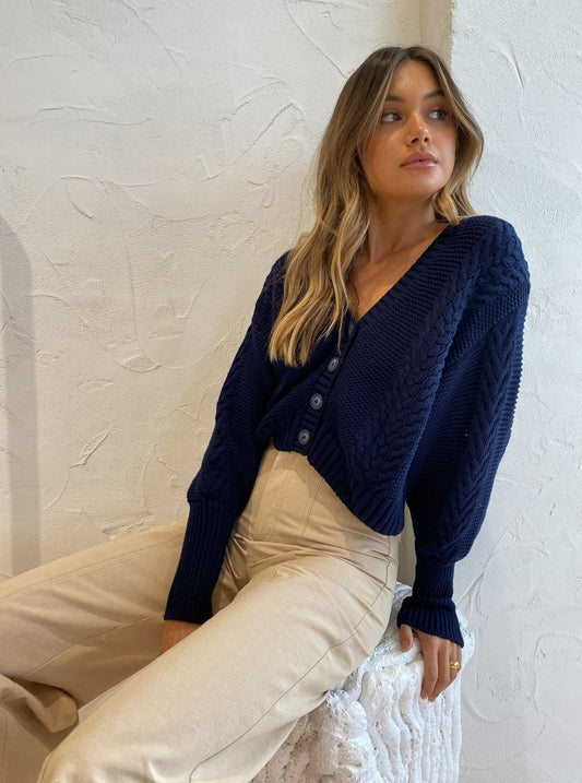 The Angela Knit Cardigan in Navy from SUBOO adds vintage casual cool to any knitwear repertoire.