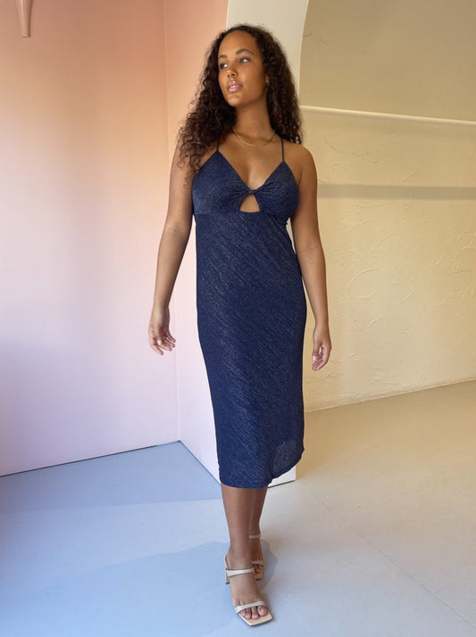 A timeless silhouette for special Coco moments, your favourite Suboo Asha Lurex Jersey Twist Front Slip Dress is back in a Navy colourway.