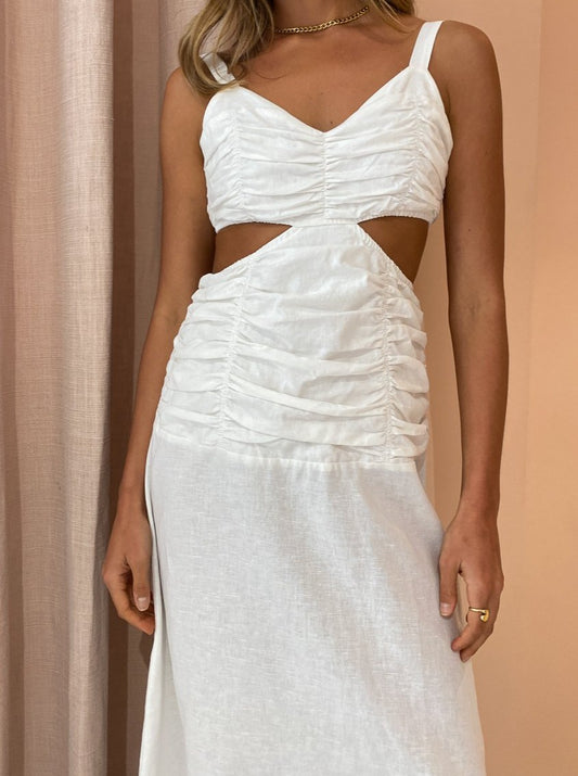 Crafted from a Linen Cotton blend fabrication, this maxi dress is designed to form and accentuate the femme bod beautifully. Featuring a soft V-neckline and rouching detail at the hips which flows into a subtle A-line skirt.