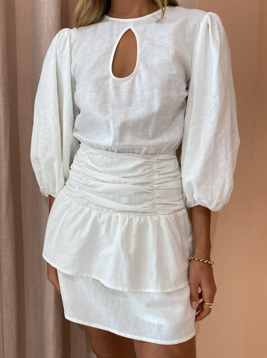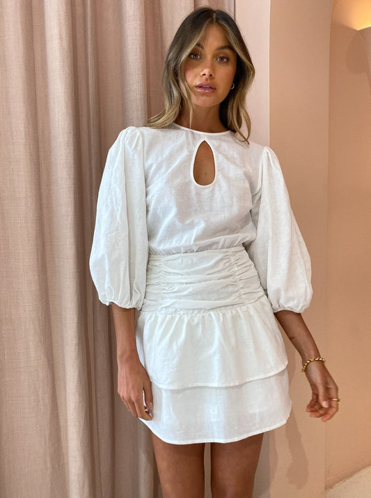 The Aster Sleeved Mini Dress in White by Suboo has our Coco girls elegantly floating from lunch with the girls to dinner dates with their loved one.