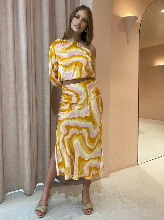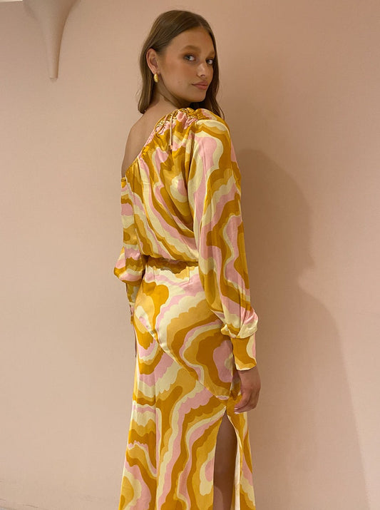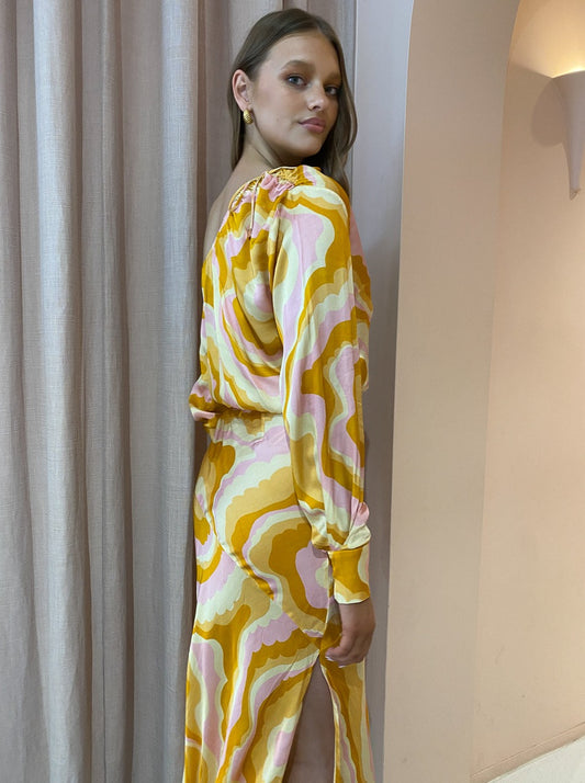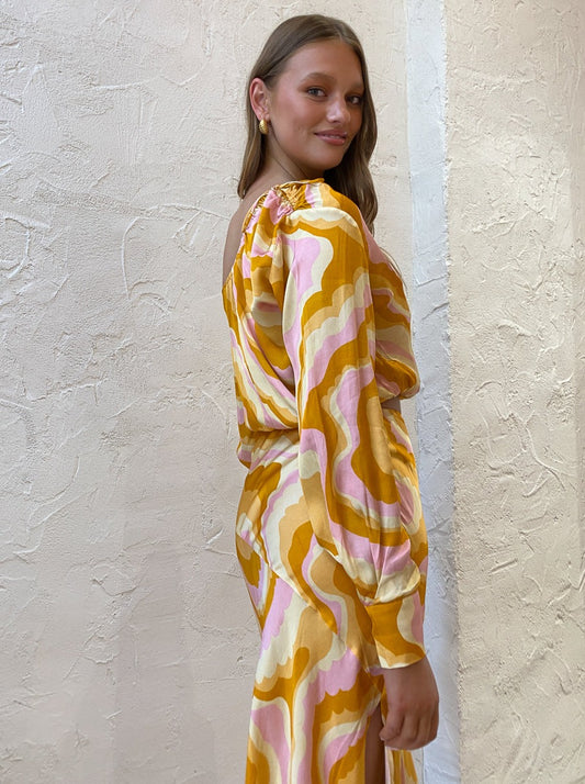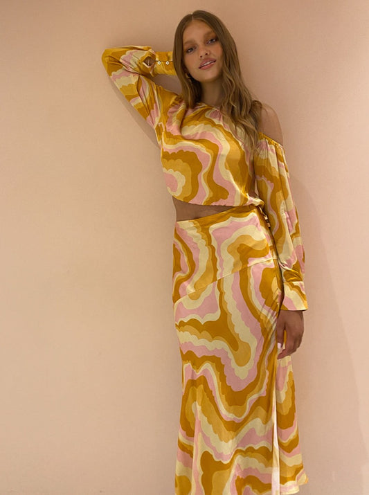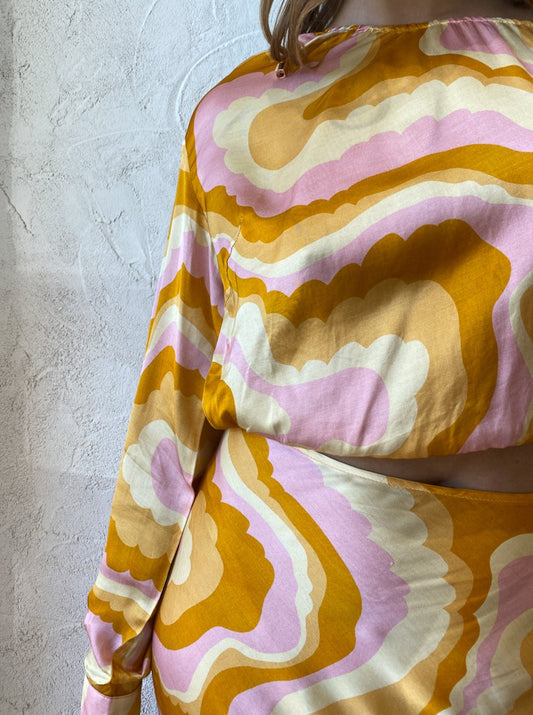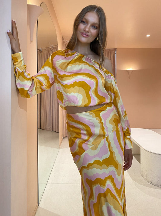Turning heads with the bold 70's inspired cloud print, this Blouse can be perfectly paired with the Cloud Bias Flared Slip Skirt for special sun-kissed moments or paired back with denim to brighten up your everyday.