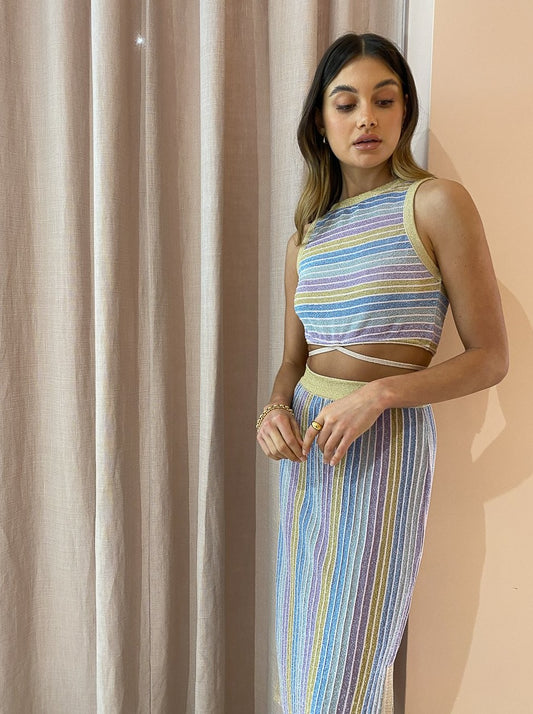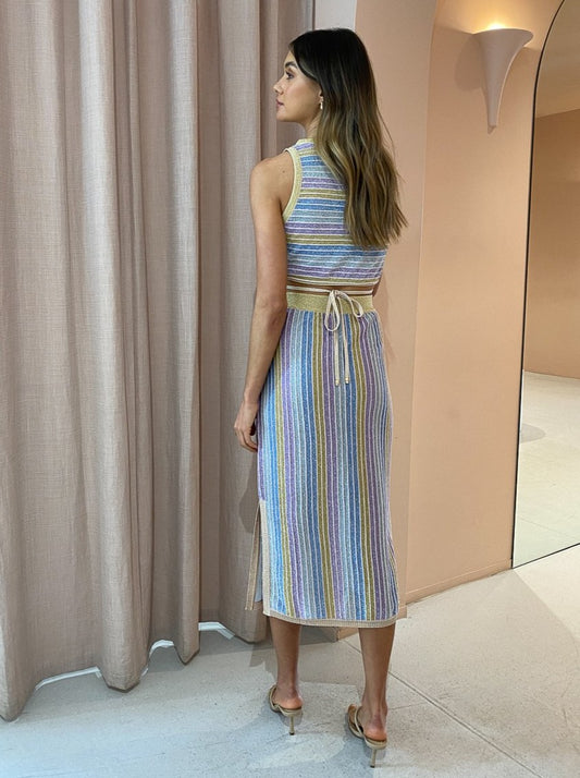 Shimmer through your special Coco moments wearing the Suboo Elise Side Split Skirt in Lilac Stripe Metallic.