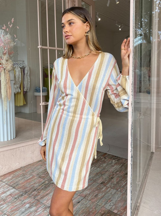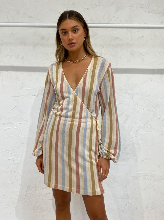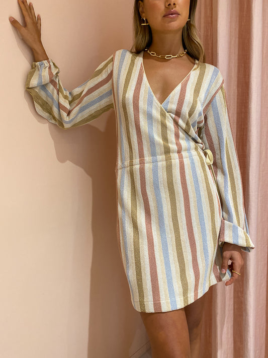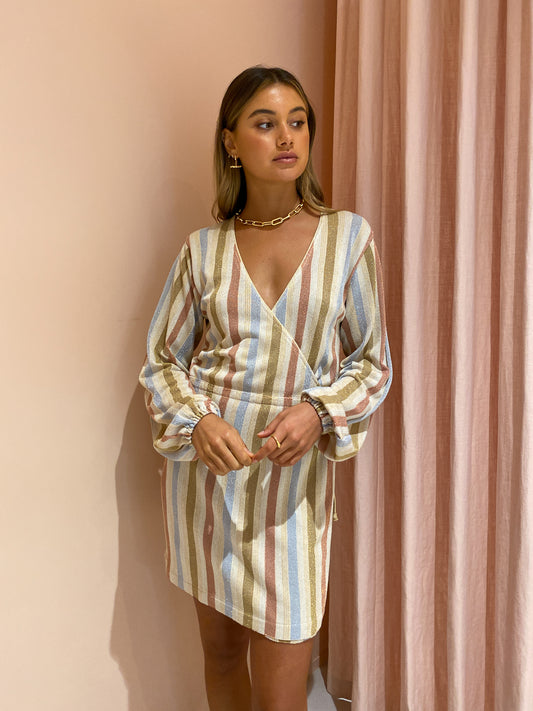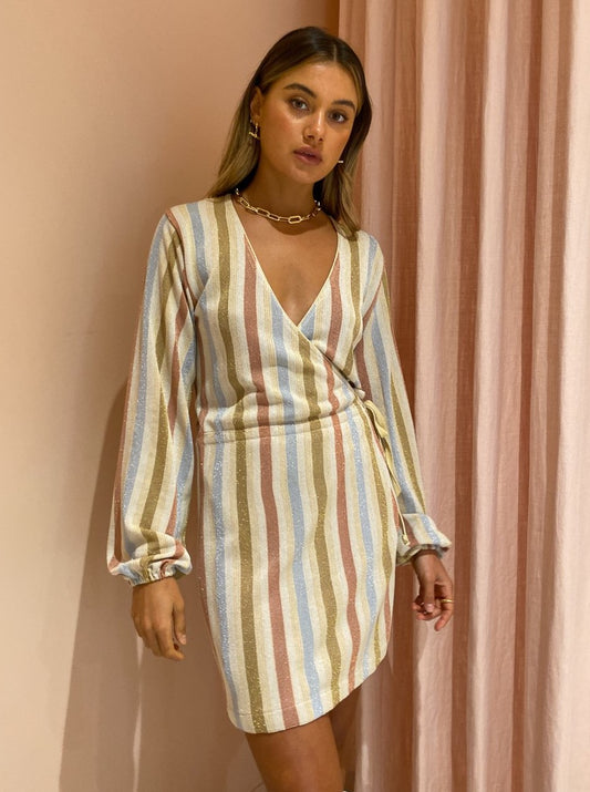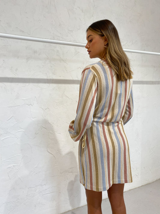 Designed in a striped metallic yarn with hues of pale blue, neutral red and rose gold. This wrap dress will be a versatile piece in your wardrobe.