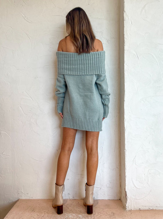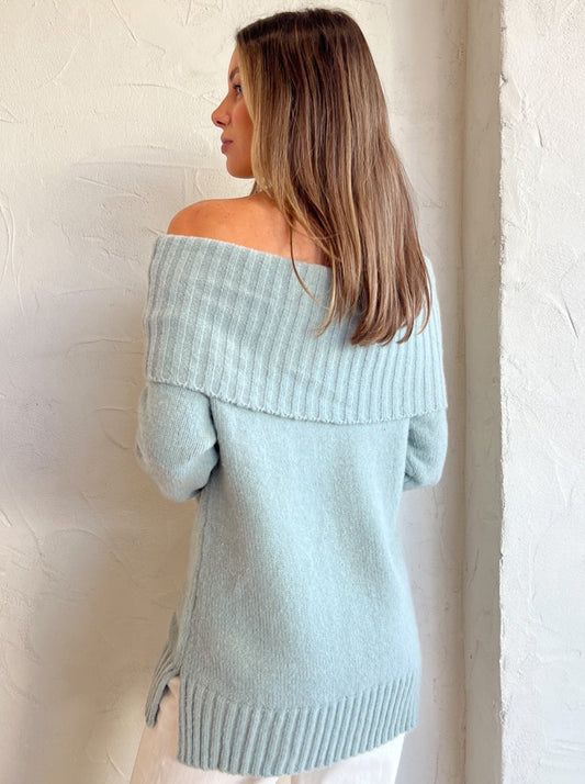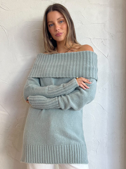 Experience the allure of timeless elegance with the Suboo Jean Off Shoulder Knit Jumper in Seafoam.