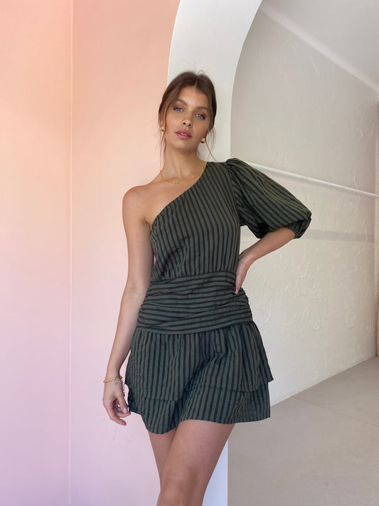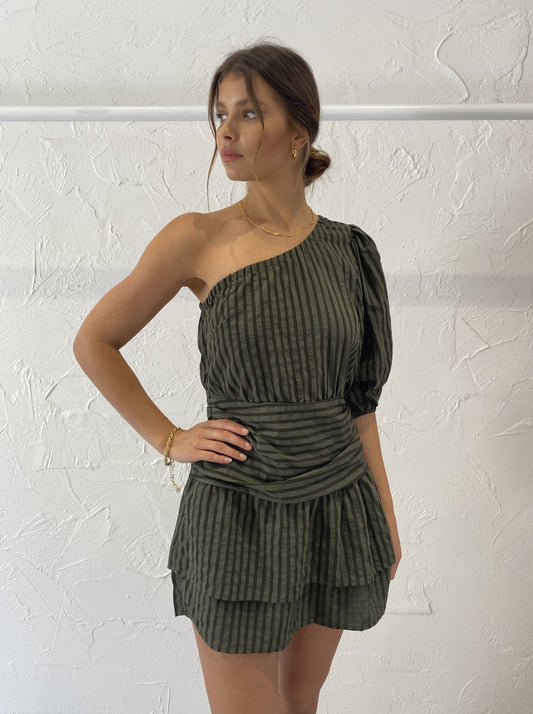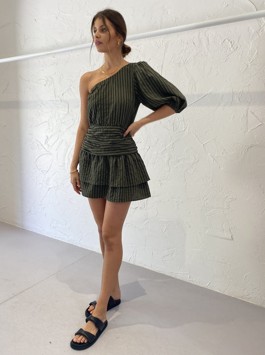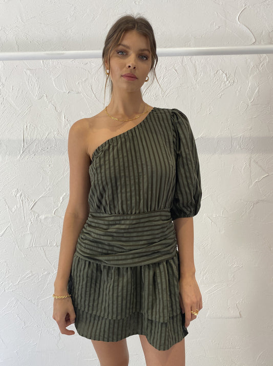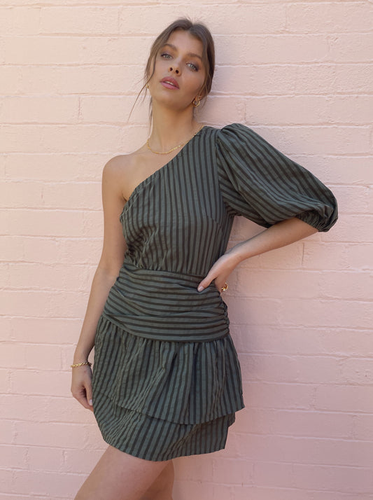 The SUBOO Queenie One Shoulder Dress in Olive Green is the perfect dress to bring you through the seasons.