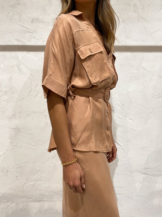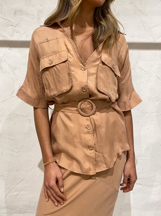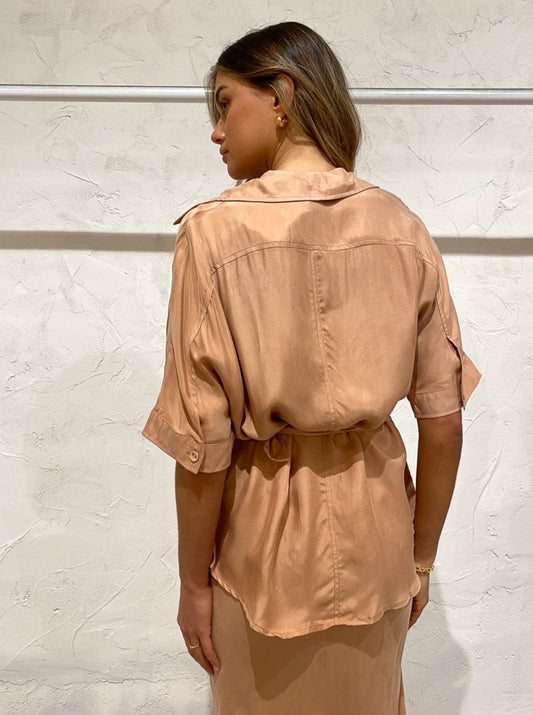 Designed with the Coco girl in mind, this effortlessly stylish relaxed fit silhouette is cut from a silky cupro blend with a v-neckline and button down centre front and a mid-length sleeve.
