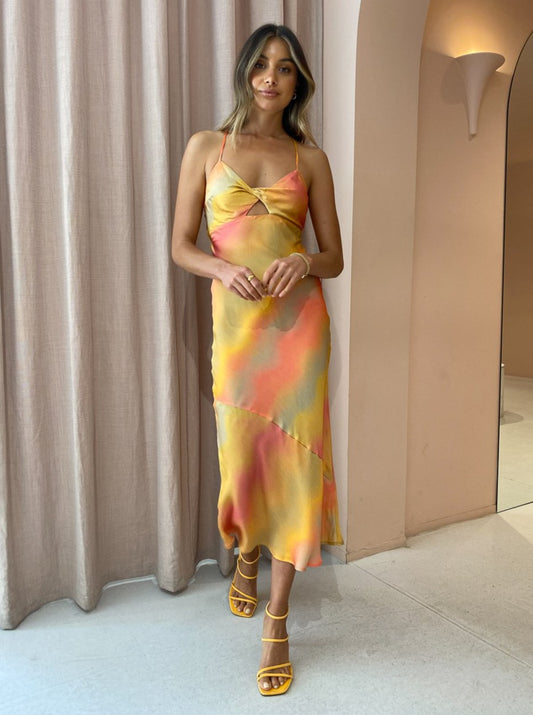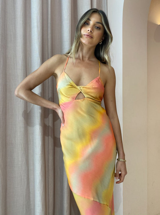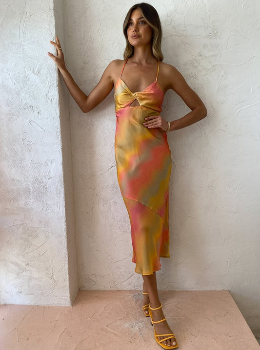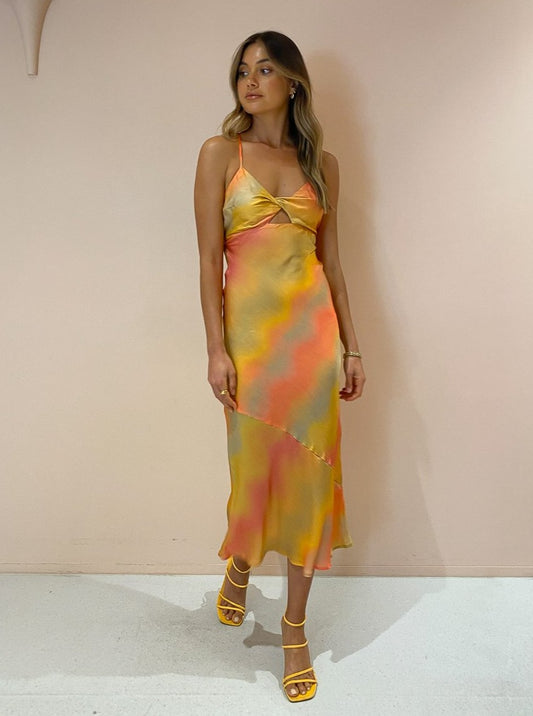 With retro psychedelic styling, the Suboo Sundown Twist Front Slip Dress in Sunset Ombre is the golden hour piece to complete your Summer wardrobe.