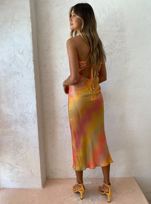 A signature Suboo moment, this midi silhouette is crafted from a soft and silky Viscose blend in a psychedelic Sunset Ombre print. A slip style that delicately graces the femme form, we adore the bralette style bodice with adjustable rouleau straps that cross over at the back and self tie bow back for increased room around the bust.