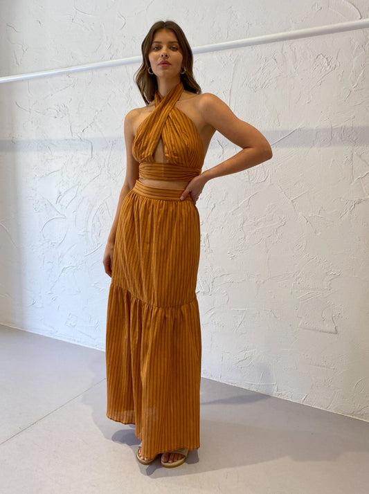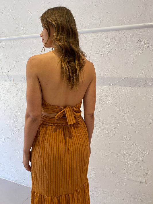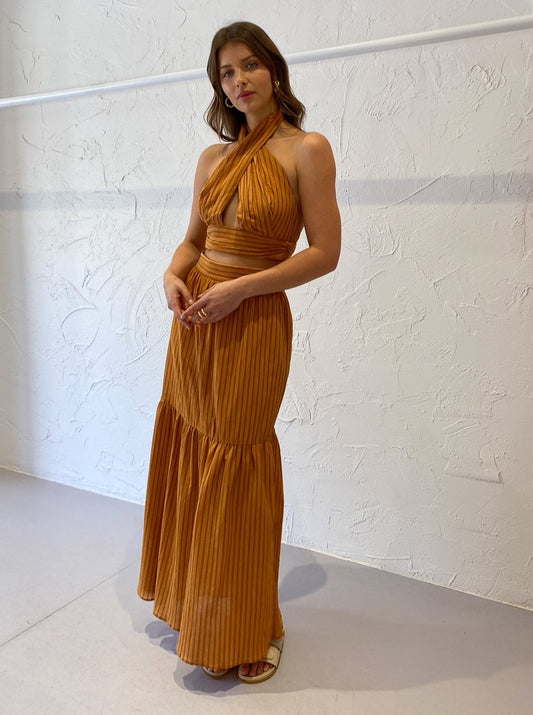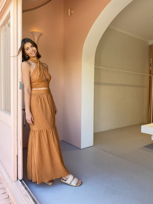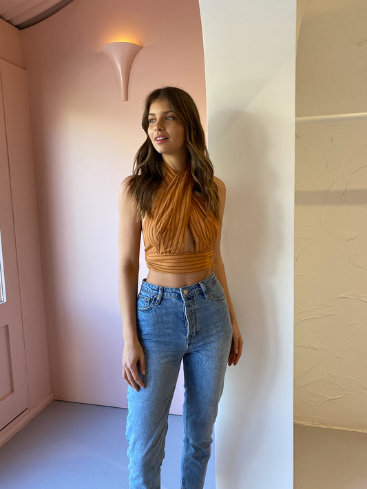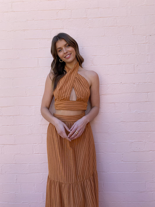 The Third Form Crossing Over Top in Desert is the perfect halter crop for your spring/summer wardrobe. The subtle dark stripe on the textured fabric bring this top to life.