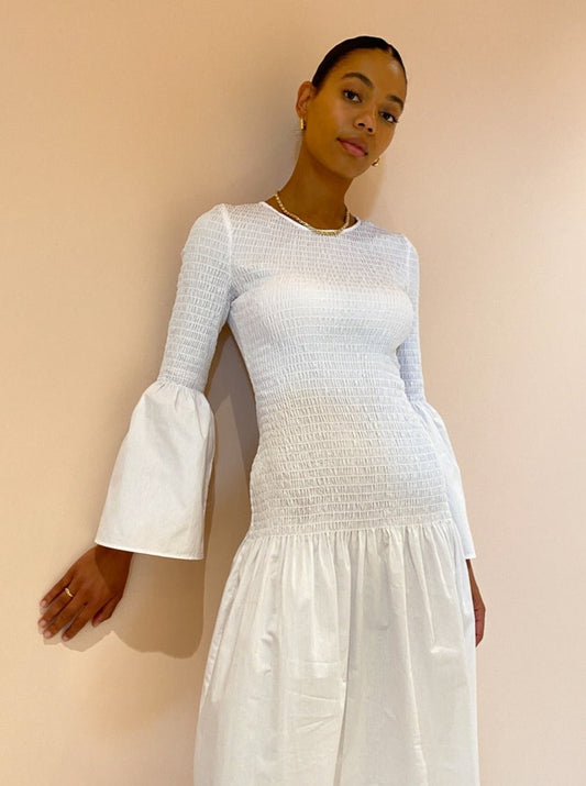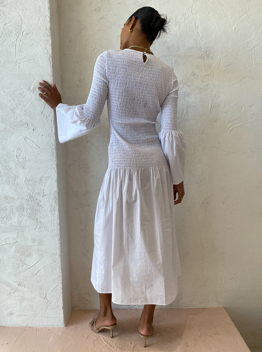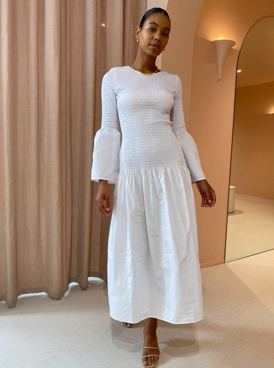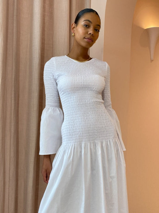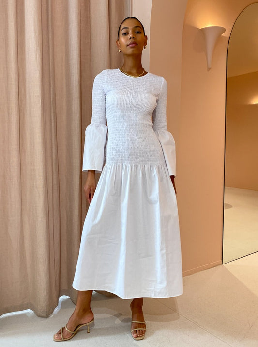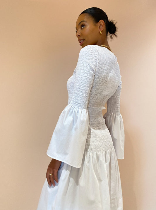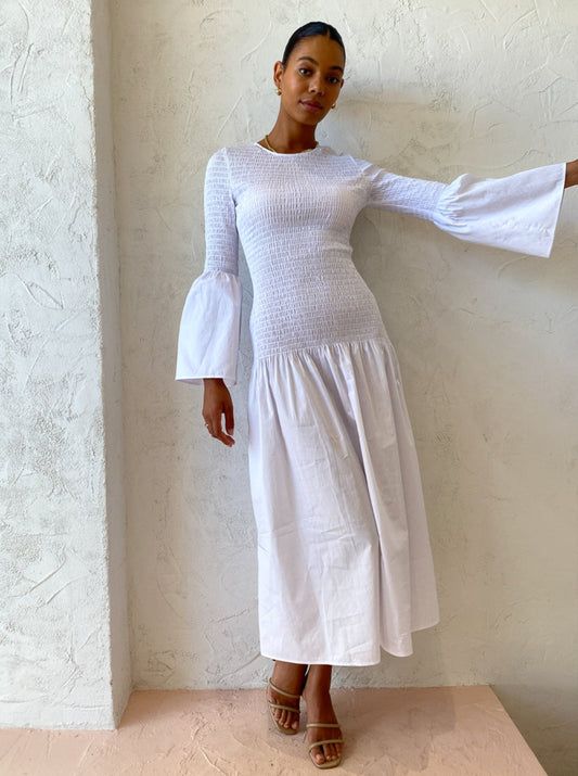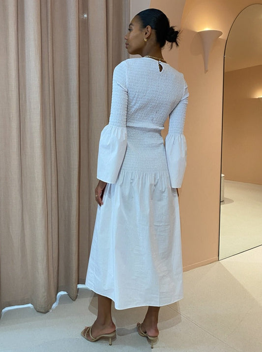 Crafted from a Cotton fabrication in classic White, this flattering maxi dress features a high crew neckline and long bell sleeves before falling into an elegant maxi skirt.
