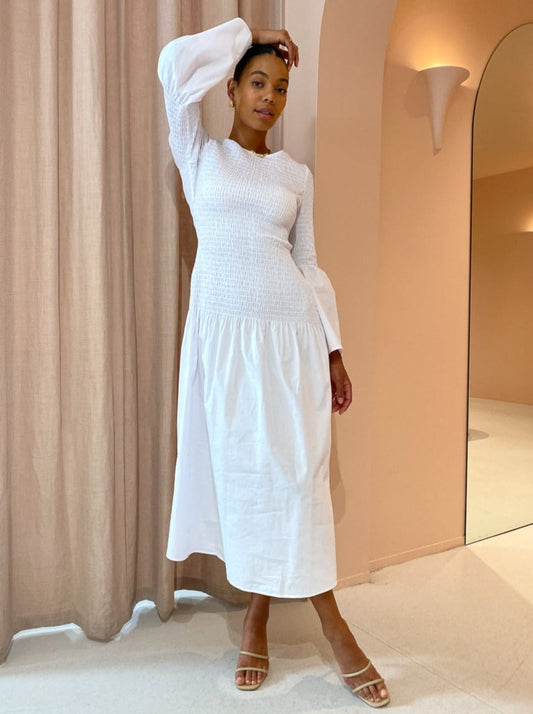 The Third Form Full Form Shirred Maxi Dress in White has us falling in love with romantic silhouettes with a modern textured touch.