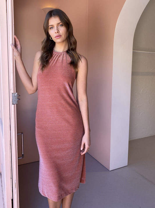 Crafted from a super fine metallic knit and featuring a halter and low cut back, this will have you turning heads in an effortless and chic way.