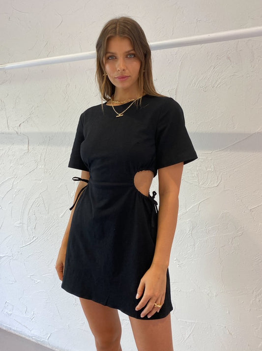 The Third Form Pressed Flowers Draw Side Tee Dress in Black is a classic LBD with a modern twist.