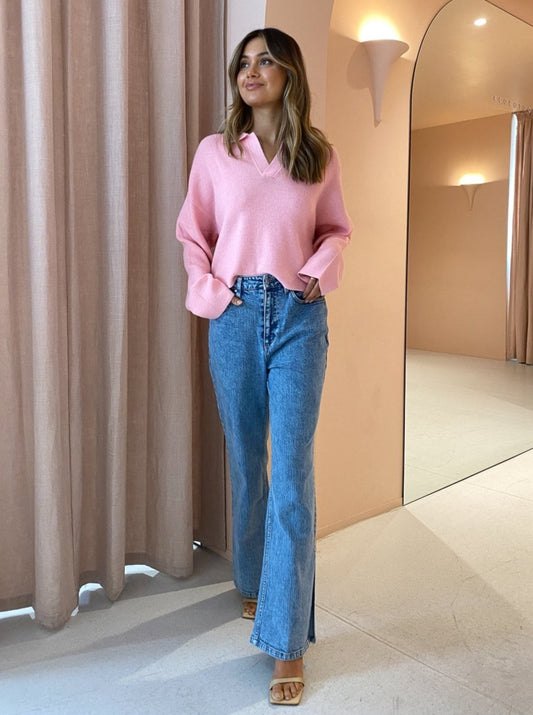 Coco Styling Tip: Complete the look with the Third Form Oversized Collared Knit in Baby Pink, the Alias Mae Cassie Heel in Natural and the Reliquia Baby Coralia Earrings in Gold