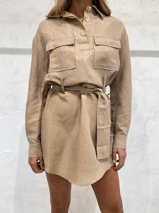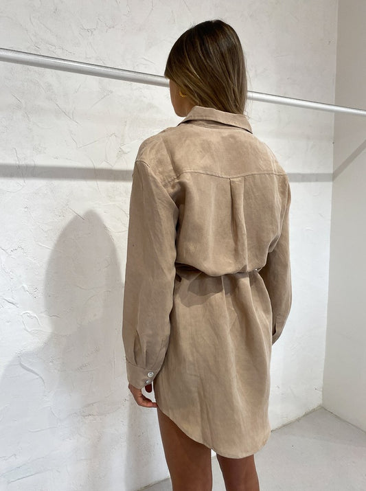 Cut from a premium breathable curpo and linen blend with a slight sheen, this mini length silhouette is designed to fit relaxed on the body with a belt loop and self tie waist to accent the femme form. Influenced by utilitarian shirting it features a concealed placket and button through closure.