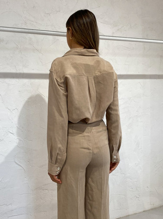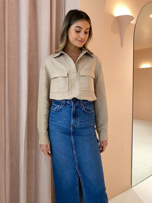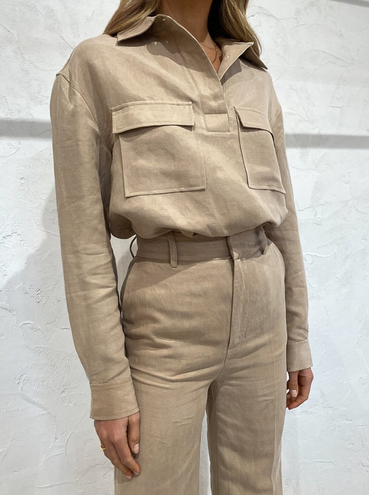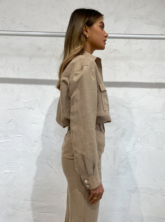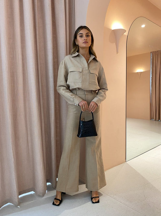 Referencing utilitarian shirting, the Street Smart Shirt is a sophisticated and feminine silhouette with a slight sheen cut from a breathable light-mid weight premium curpo and linen blend.