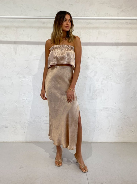 The Third Form Waters Edge Bias Maxi Skirt in Misty Rose is a 90's style slip skirt that will become a staple in your Coco wardrobe.