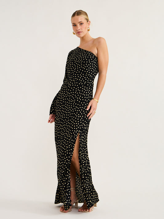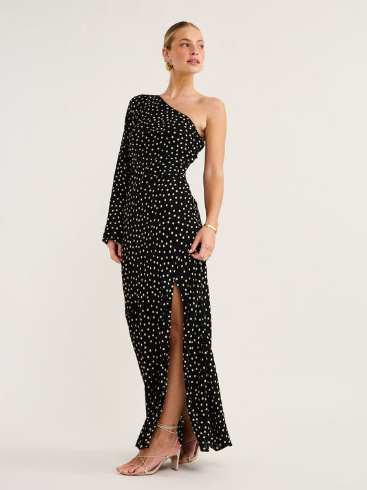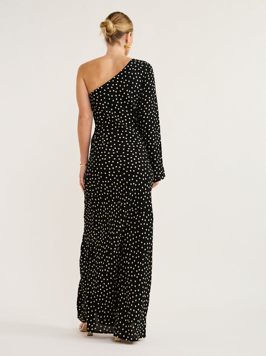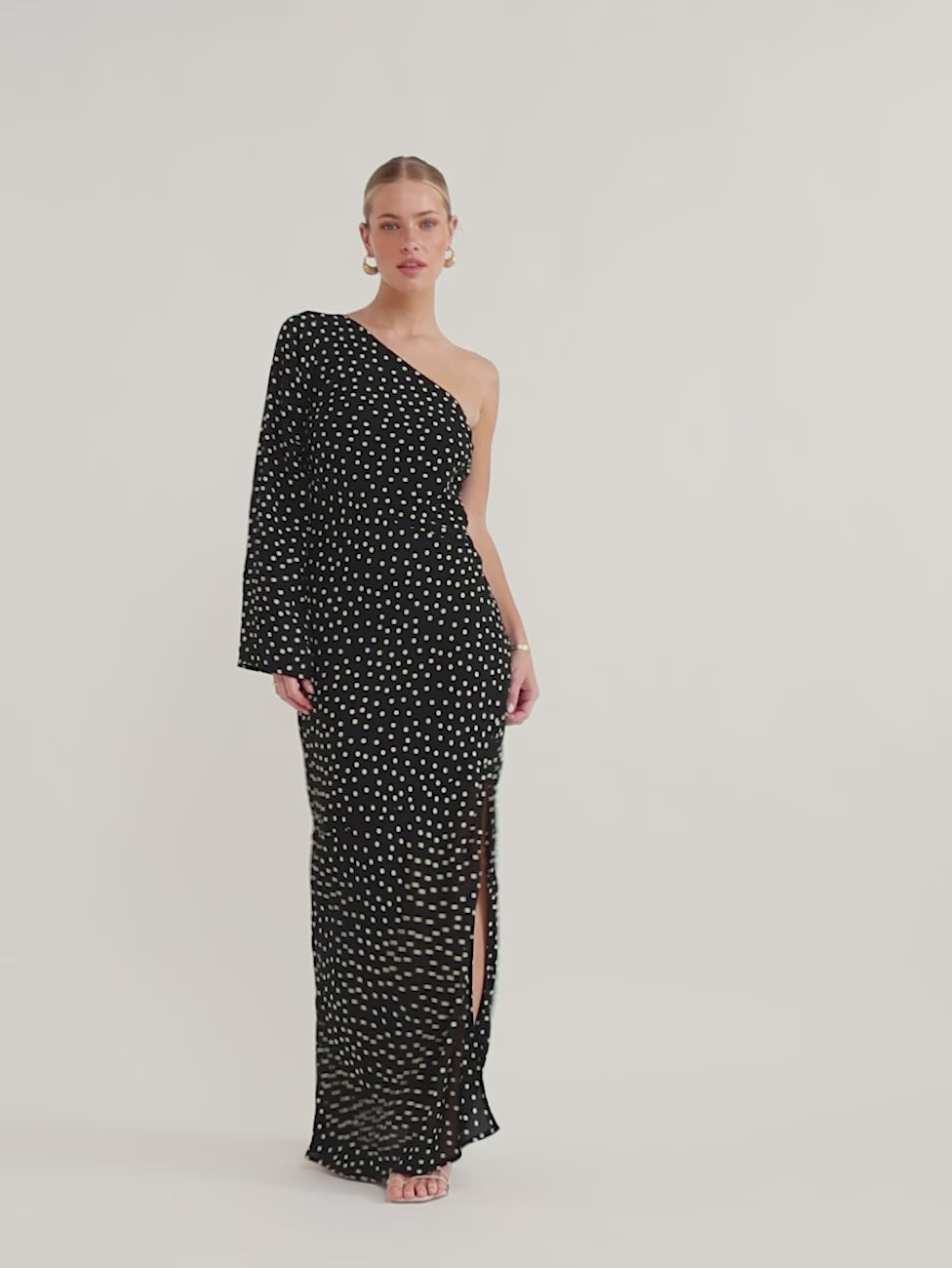 Featuring a classic monochrome spot print, this ankle length dress features a flattering fit, asymmetric neckline with one sleeve design, and a split hemline.