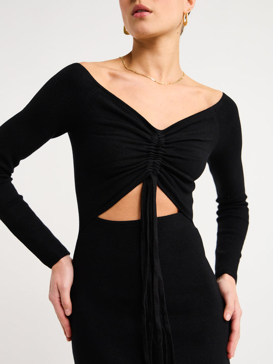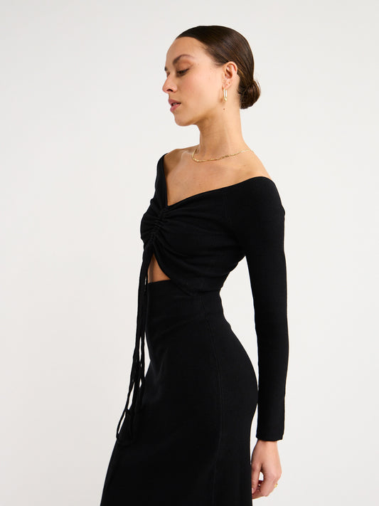 Featuring a midi length long sleeve cut, an off-shoulder silhouette, and a centre-front drawstring bust detail, this piece skims the body for a flattering fit.