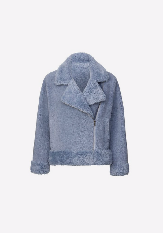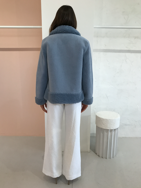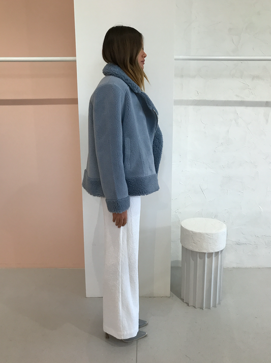 The Himalaya Jacket has been crafted in an oversized biker jacket silhouette with subtle hardware. Luxe vegan shearling creates cosy texture in a soft blue palette.