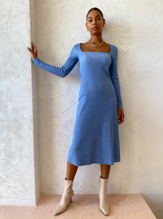 Crafted from a signature Cotton Marle fabrication, this ribbed midi dress is designed to perfectly skim and flatter the body. Featuring a square neckline to highlight the décolletage, full length sleeves and curved paneling to accentuate the bust before softly falling into a flowing midi skirt.