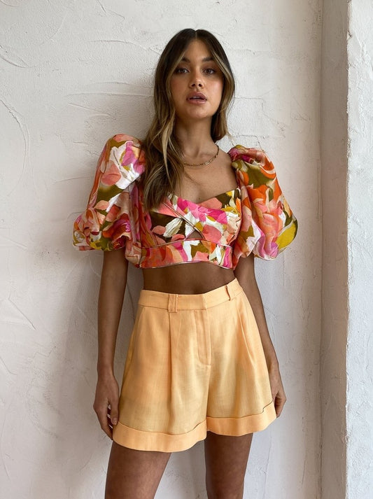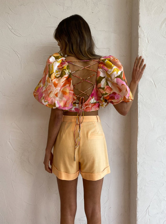 Paired with the beautiful Acler Porter Top in Pink Bouquet and the Alias Mae Lena Heel in Natural, the Dawson Shorts in Peach are perfect for special Coco moments.