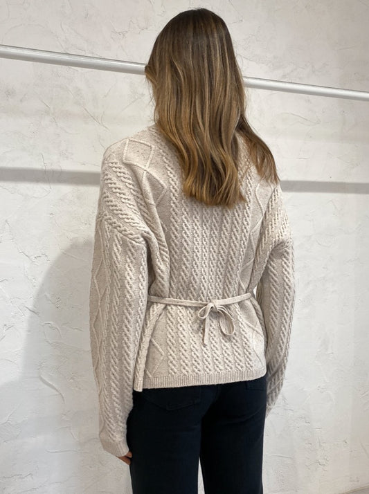 Crafted from a breathable cable merino wool blend, this neutral knit is a Coco essential for transeasonal dressing. Featuring a crew neck, wide sleeves that taper into narrow ribbed cuffs and a single waist rouleaux tie at back to accent the femme form.