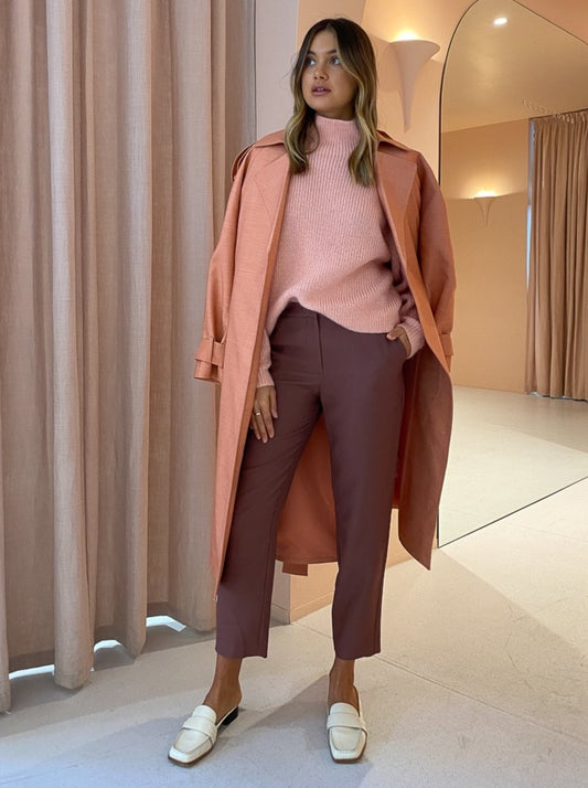 With the slimline cigarette cut paired with the warming tobacco colour palette, these soft suit pants add a flattering silhouette with a touch of modern minimalism to any Coco closet.