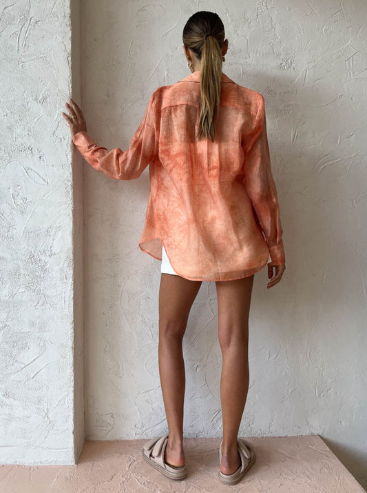 Crafted from a luxurious modal blend, this shirt has been dyed in a Japanese shibori technique to give a unique peach hued pattern. Sitting oversized and relaxed in its silhouette this shirt is contrasted with its tailored collar, button through front placket, fitted cuffs and front patch pockets.
