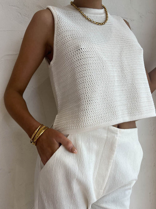 For desk to drink styling, complete this refreshing ensemble with the Assembly Aubrey Knit Tank in White, the Alohas Twist Strap in Camel and the Porter Chunky Belcher 2.0 Necklace in Gold